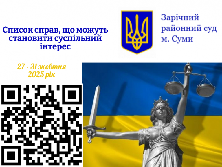 27.10.2025 на 15 год 00 хв кримінальне провадження № 591/821/24 стосовно колишнього заступника голови Сумської обласної військової адміністрації, колишнього виконуючого обов’язки директора одного з Департаментів Сумської обласної військової адміністрації та директора Товариства з обмеженою відповідальністю за фактом розтрати та привласнення бюджетних коштів шляхом службового підроблення та використання підроблених документів (ч. 1 ст. 366, ч. 4 ст. 358 та ч. 5 ст. 191 КК України). Директор ТОВ також обвинувачується в легалізації доходів (ч. 1 ст. 209 КК України). Колегіальний розгляд: головуючий суддя Клімашевська І.В., судді Сидоренко А.П., Клименко А.Я.