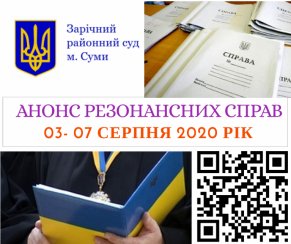 06.08.2020 на 13 год. 30 хв. Кримінальне провадження 591/2823/19 стосовно 16-річного хлопця, якого обвинувачено у зґвалтуванні (ч. 1 ст. 152 КК України) та нанесенні потерпілій легких тілесний ушкоджень, що спричинили короткочасний розлад здоров’я (ч. 2 ст. 125 КК України), суддя – Капкін О.Б.