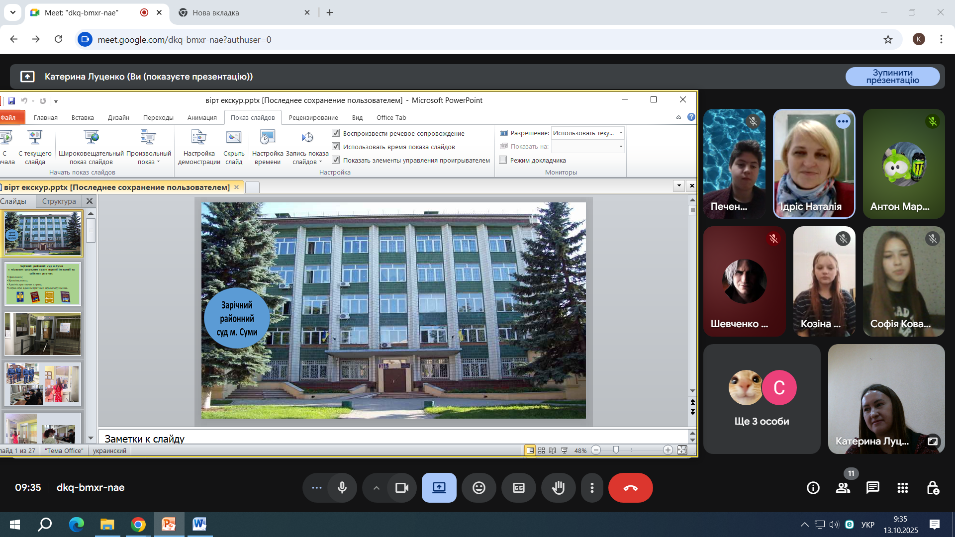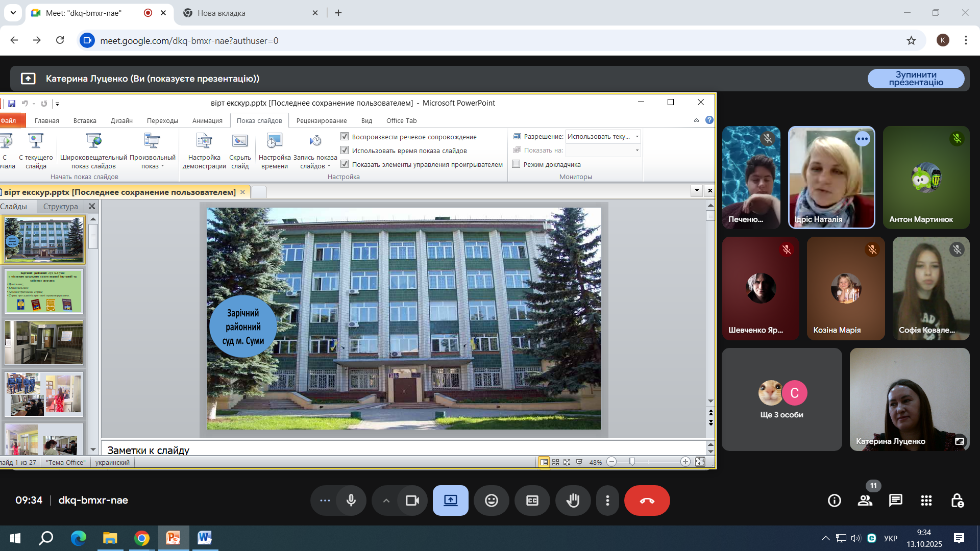 13, 14, 15 та 17 жовтня помічник голови суду Катерина ЛУЦЕНКО провела онлайн-лекції та віртуальні екскурсії для учнів 7-х і 10-х класів КУ Сумської загальноосвітньої школи І–ІІІ ступенів №4 імені Героя України Олександра Аніщенка СМР.
