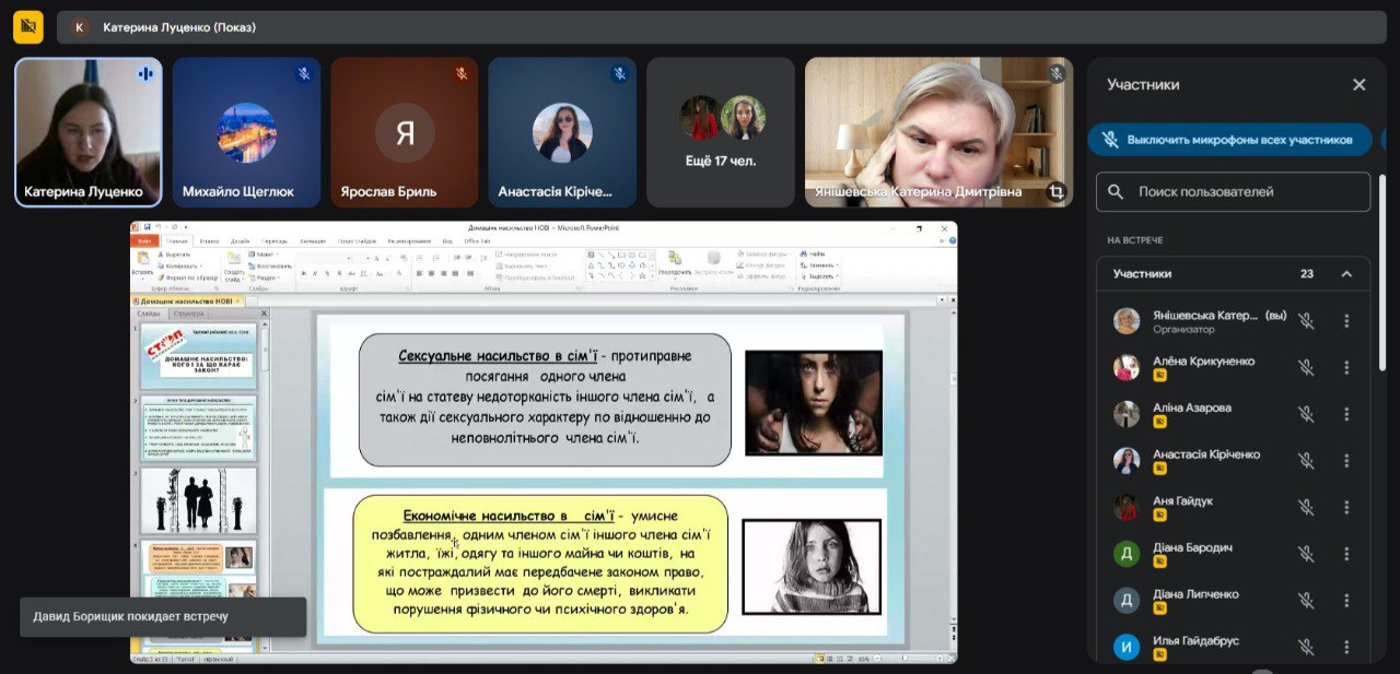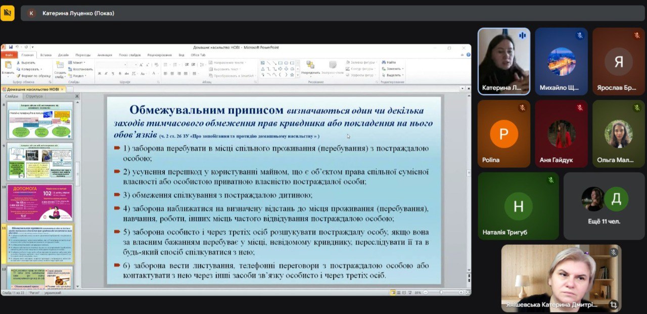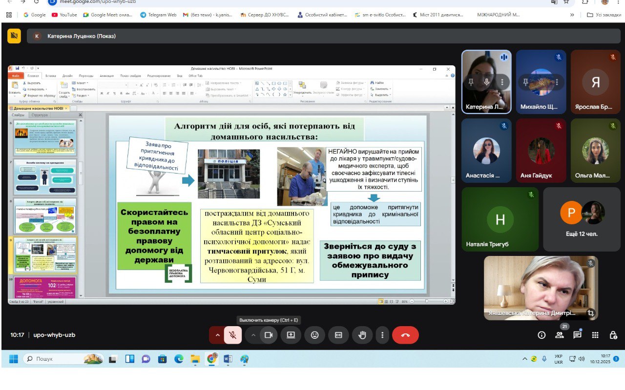 У межах щорічної міжнародної акції «16 днів проти насильства», яка проводиться з 25 листопада по 10 грудня та спрямована на привернення уваги до проблеми насильства в сім’ї та суспільстві, 10 грудня 2025 року відбулася онлайн-лекція для здобувачів освіти 1 курсу спеціальності K9 «Правоохоронна діяльність» та 2 курсу спеціальності 081 «Право» Навчально-наукового інституту права Сумського державного університету.