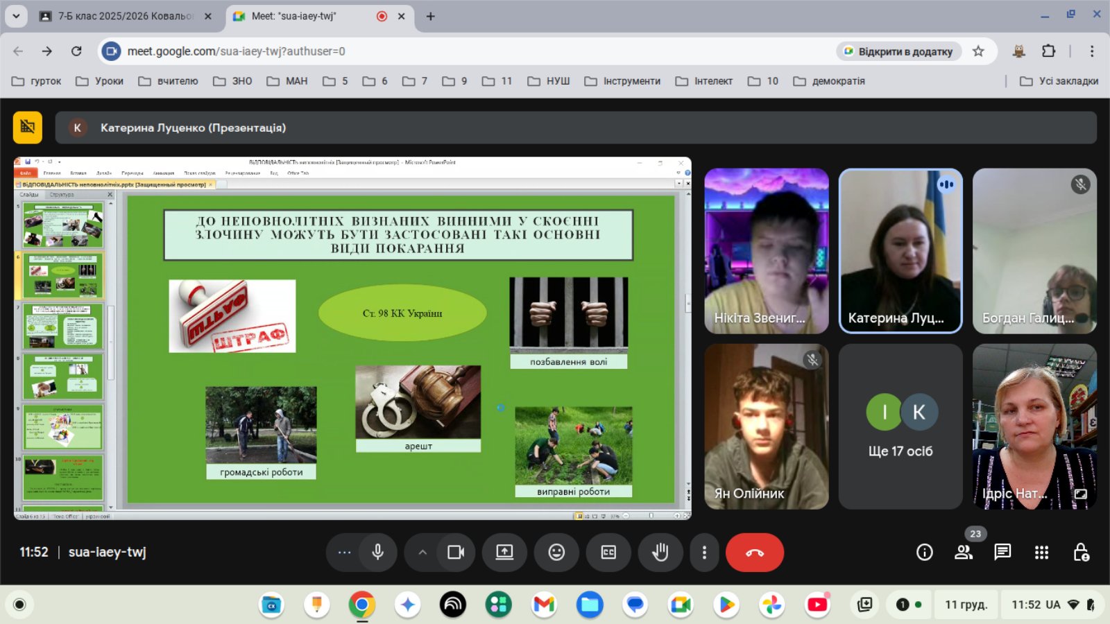 11 грудня 2025 року з метою підвищення рівня правової обізнаності молоді та формування відповідального ставлення до власної поведінки помічник голови Зарічного районного суду м. Суми Катерина ЛУЦЕНКО провела онлайн-лекцію для школярів на тему «Відповідальність неповнолітніх».