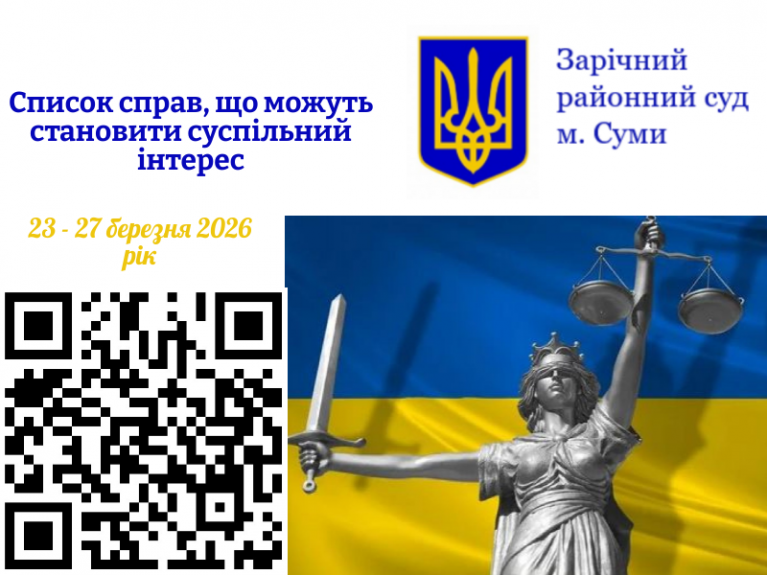 23.03.2026 на 10 год 00 хв кримінальне провадження № 591/4099/20 за обвинуваченням чоловіка в організації та готуванні насильницьких дій стосовно народних депутатів України у зв’язку з їх державною та громадською діяльністю (ч.1 ст.14,ч.3 ст. 27, ч.2 ст. 346 КК України), головуючий суддя Ковтун О.М.