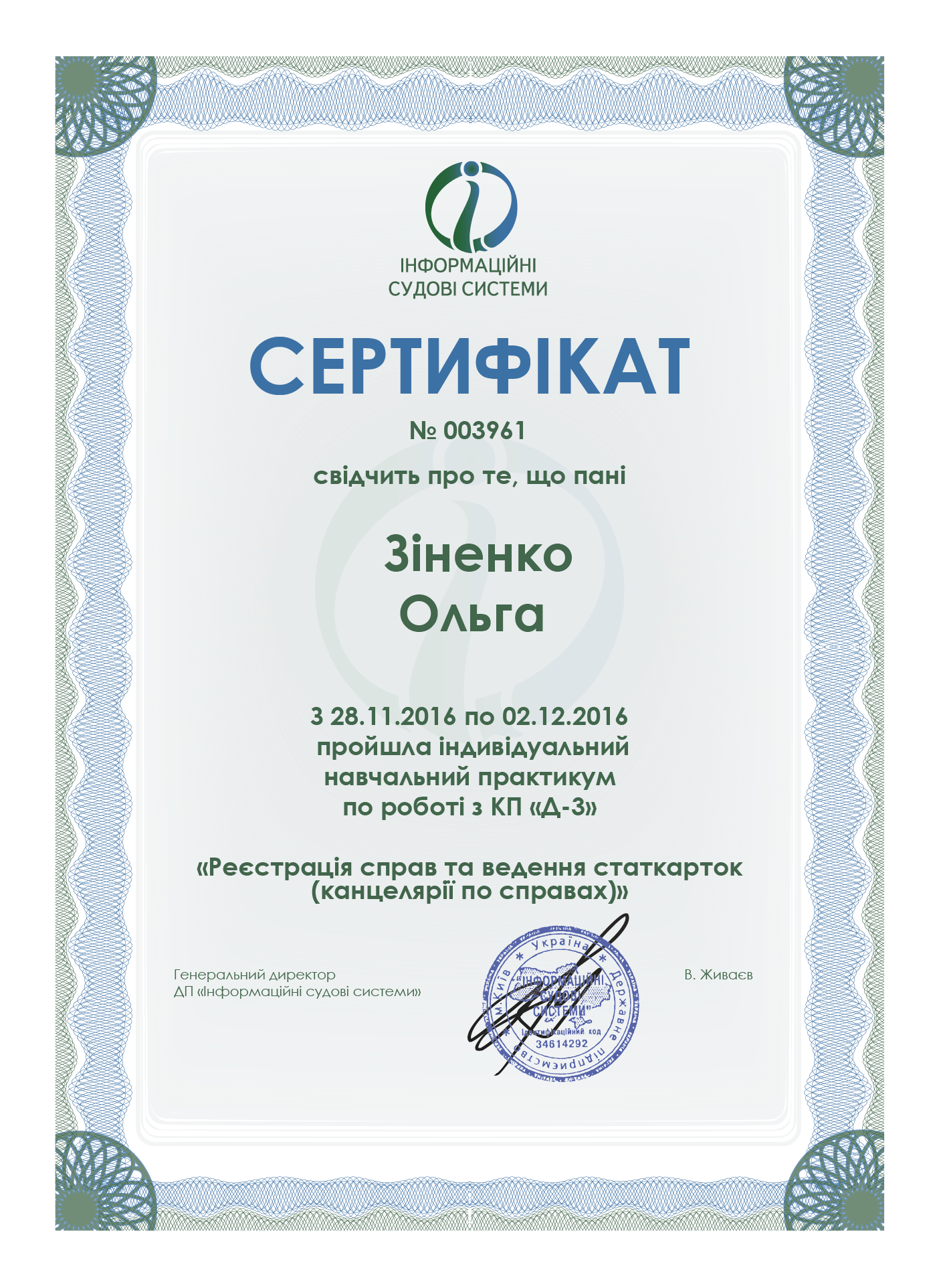 У період з 28.11.2016 р. по 02.12.2016 р. провідні спеціалісти із забезпечення автоматизованого документообігу та судової статистики Ольга Зіненко та Юлія Хілько пройшли індивідуальний навчальний практикум по роботі з КП «Д-3» «Реєстрація справ та ведення статкарток (канцелярія по справах)».