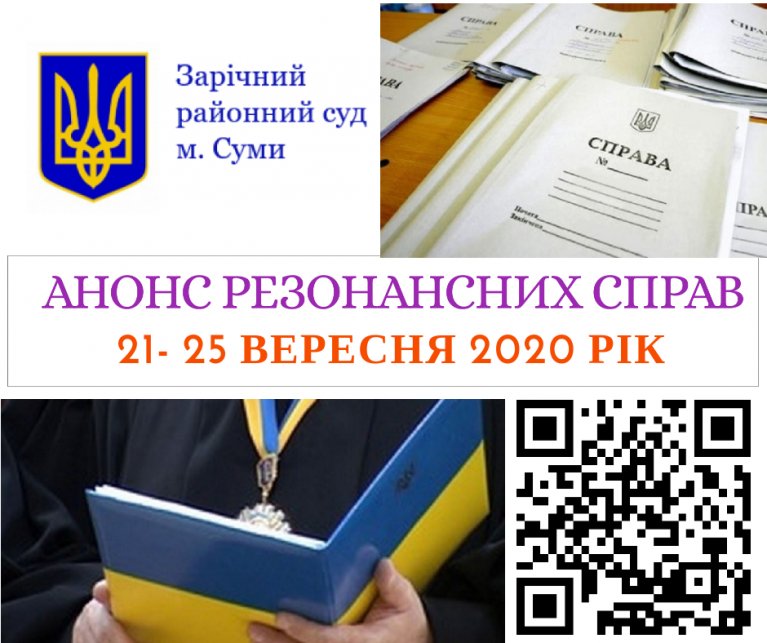 Зарічний районний суд м. Суми повідомляє, що список справ, які розглядатимуться судом у період з 21 по 25 вересня 2020 року і можуть становити суспільний інтерес, розміщені на веб – сайті суду в розділі «Інформація по справам» за посиланням: https://bit.ly/2RKuyXP.