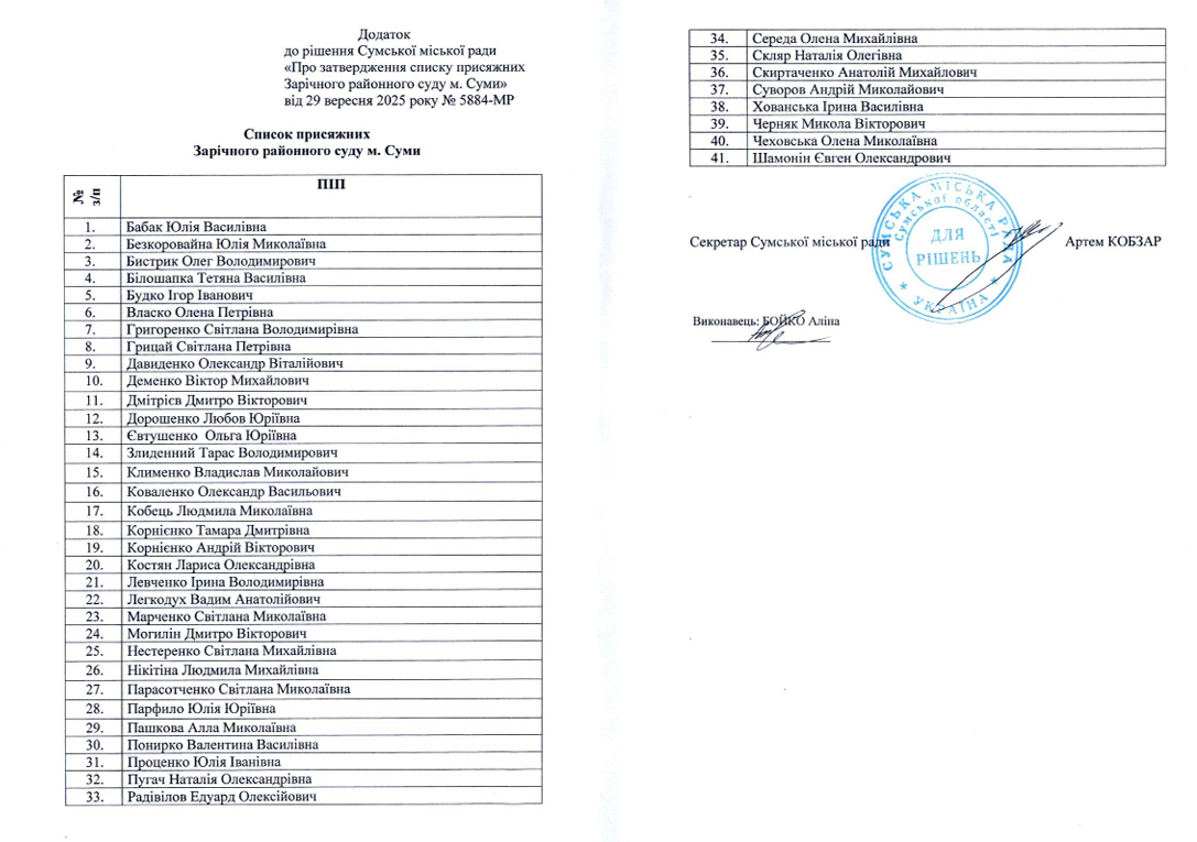 Відповідно до рішення Сумської міської ради від 29 вересня 2025 року № 5884-МР було затверджено новий список присяжних Зарічного районного суду м. Суми.